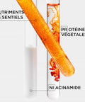 Dans cette brume protectrice thermique, les grains entiers de blé, de maïs et de soya agissent comme un complément alimentaire. Mélangés à des acides gras, des omégas et des vitamines, ils apportent aux cheveux des nutriments essentiels.