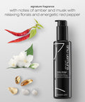 Notes d’ambre et de musc, avec des touches florales apaisantes et un pep énergisant de poivre.