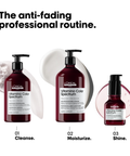 Appliquer ensuite le soin revitalisant ou le masque Vitamino Color Spectrum, puis le sérum brillance sans rinçage Glass.